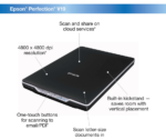 The affordable, compact Epson Perfection V19 offers easy scanning and sharing. Whether you’re scanning photos or documents, the V19 delivers 4800 dpi optical resolution (1) and fast speeds. Capture letter-sized documents in just 10 seconds (2). Easy-to-use buttons make scanning directly to computers, emails or PDFs simple. Scan and share on cloud services such as Evernote (3). Only one USB connection is required for power and connection to the computer. No warmup time is needed. The built-in kickstand saves space with vertical placement. The removable lid accommodates bulky photo albums. Software for restoring color to faded photos and removing dust is included.
